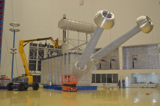 t2特高压试验大厅正在进行扎鲁特-青州±800kv特高压直流输电线路工程高端换流变试验